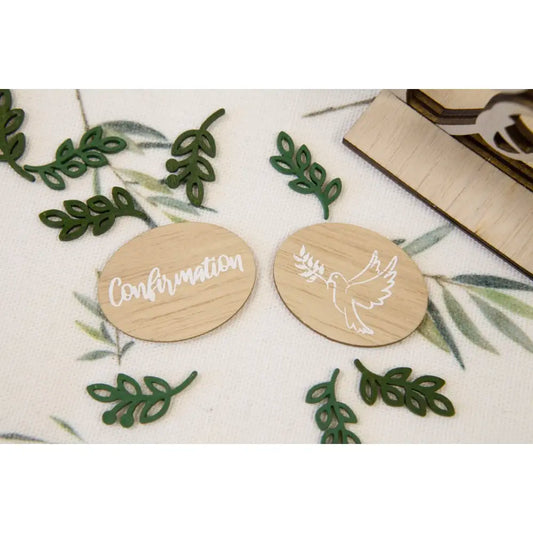6 Décos à parsemer "confirmation" et colombe en bois naturel - 4 x 3 cm